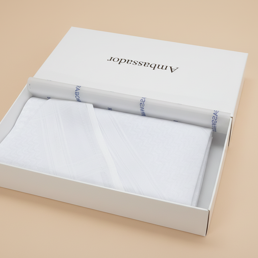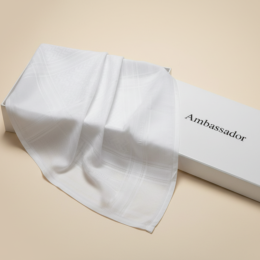 شماغ السفراء الفاخر - قطعة مميزة تجمع بين الأناقة والجودة العالية. مصنوع من أجود أنواع القطن الناعم، يتميز بنسيجه الفاخر وتصميمه الكلاسيكي